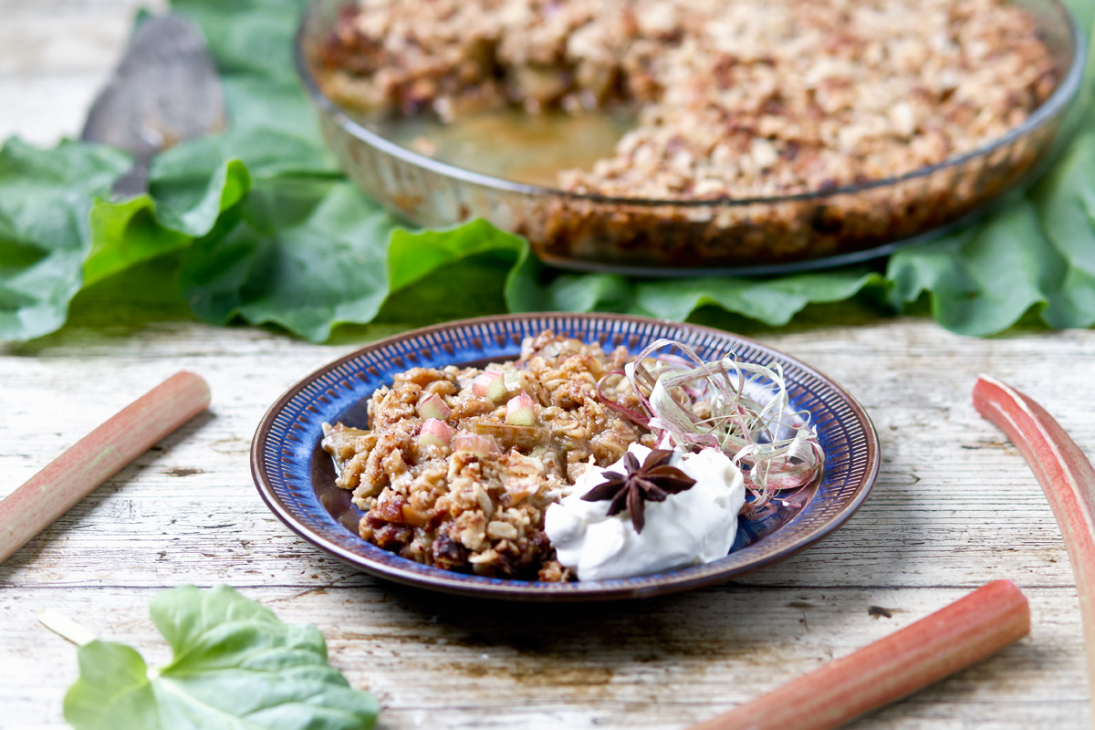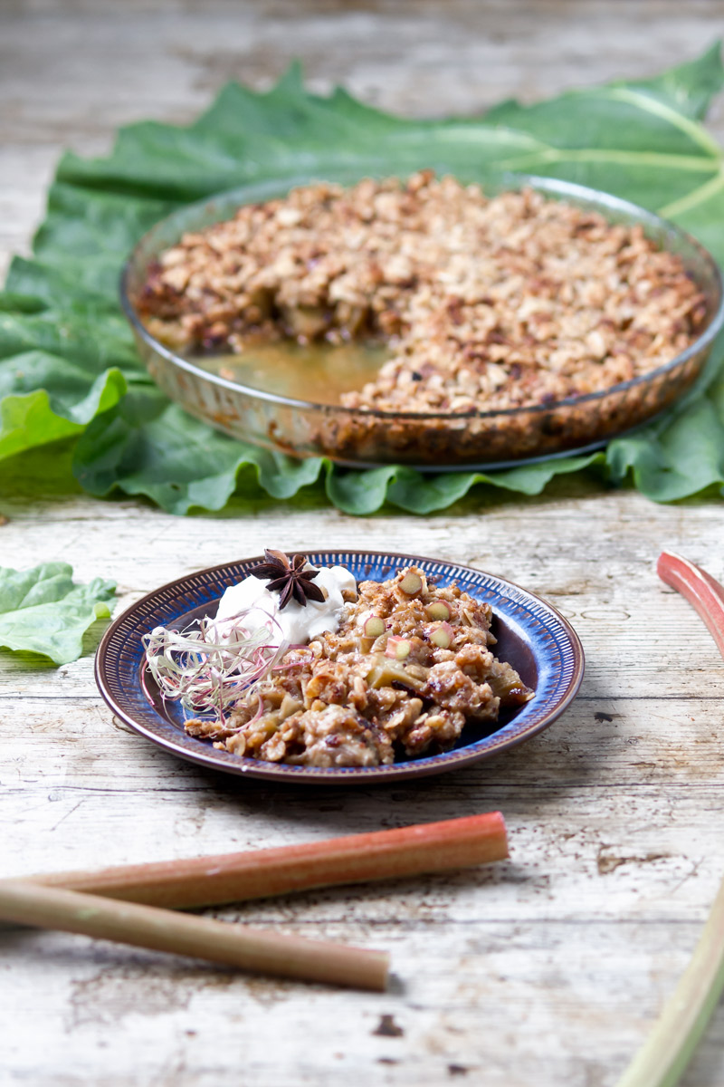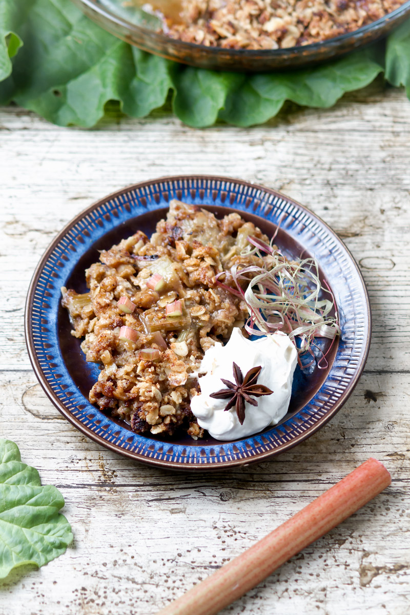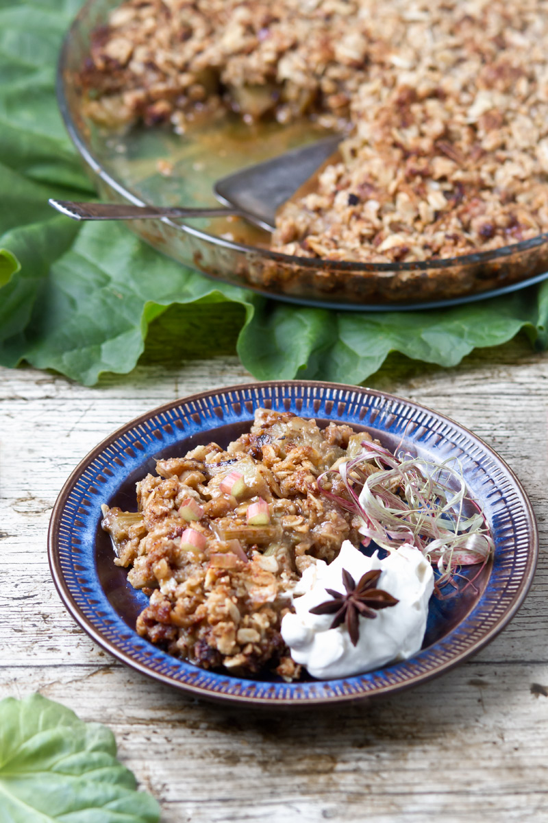 In Sweden, it’s common to eat rhubarb pie or crumble with a kind of vanilla cream. What you see in the photo is a half-and-half mixture of whipping cream and vanilla cream, both oat-based. Whether you need to go out and buy some rhubarb, or you have some growing in your backyard, you should really try out this rhubarb crumble, with almond and star anise soon! In fact, I think I’ll have some more myself!